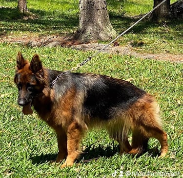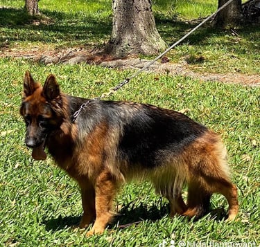 Hilda é uma linda cadela Pastora Alemã, capa preta, de pelos longos, nascida no Canil Haus Flamboyant, em Conservatória, Valença/ RJ, em 15 de janeiro de 2023.